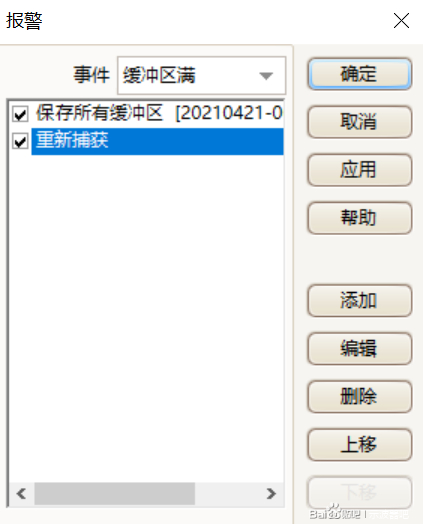 接着添加并勾选“重新捕获”,设置完成如图5所示,“保存所有缓冲区”必须在“重新捕获”之上。另外,我们也可以上移和下移动作顺序,或者重新编辑报警操作。最后点击“应用”并且确定即可。