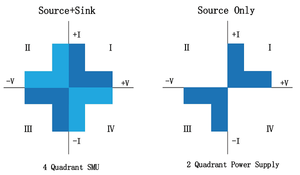 四象限:电源象限是指以电源输出电压为X轴、输出电流为Y轴形成的象限图。第一、三象限即电压电流同向,源表对其它设备供电,称为源模式;第二、四象限即电压电流反向,其它设备对源表放电,源表被动吸收流入的电流,且可为电流提供返回 路径,称为阱模式。