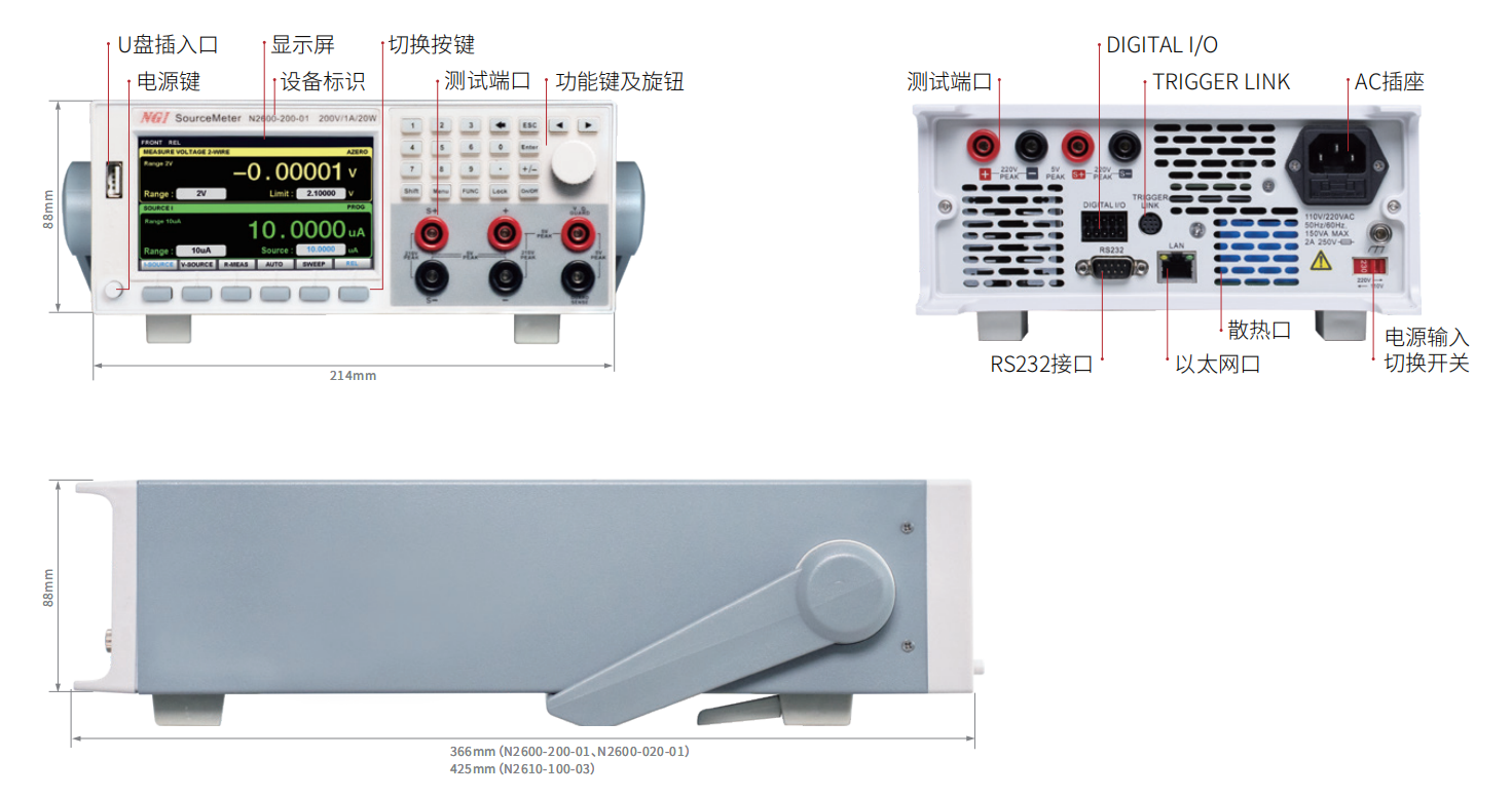 | N2600-200-01 | 1 | 200V | 1A | 20W | 电压0.02%+100μV/电流0.02%+600pA | 1μV/10pA | LAN/RS232 | 2U | |