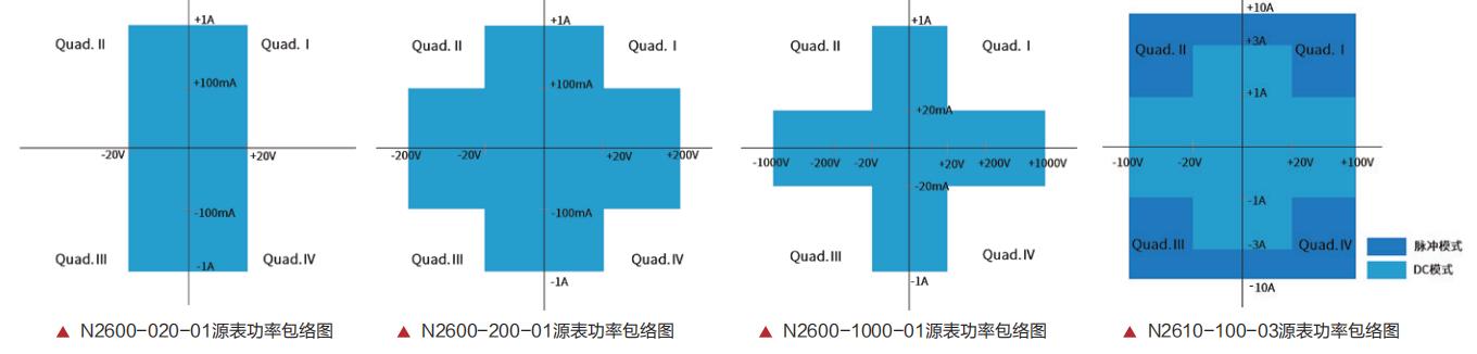 与传统矩阵电源不同,N2600系列源表在同等功率下,客户可根据实际需求,选择大电压小电流或小电压大电流输出。选择不同的量程,N2600系列源表的源/阱极限也有区别。