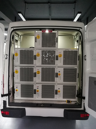 移动测试车内设备放置区结合具体设备的效率及散热方式进行必要的风道设计,具备能够自动开启的散热通风装置;
