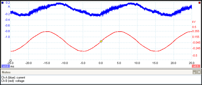 我们将风扇插入改进的延长线,然后我们将其插入电源。然后我们接通电流钳,按下“ZERO”按钮并将其钩在延长线上的带电导体环上。电流钳的BNC引线连接到示波器上的通道A. 然后我们在笔记本电脑上运行PicoScope并将其设置为在通道A上触发,并从通道A设置菜单中选择'60 A电流钳(20 A模式)'自定义探头。打开风扇后,我们在PicoScope显示屏上看到了一个嘈杂的,扭曲的正弦波。然后我们打开差分探头,将其设置为'x100'范围,并将其连接到示波器的通道B. 通过为通道B选择“x100”自定义探头,我们在显示器上看到了干净的正弦波240 V波形