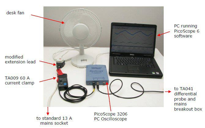 我们将测量主电源台式风扇的功率因数。选择该器具是因为它包含一个小型交流电动机,因此可能具有有趣的电流波形和低功率因数。测量设备如下: