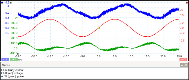 当电流和电压轨迹以正确的单位显示时,我们转向PicoScope中的数学通道功能。这创建了一个新的通道,其外观类似于输入通道,但是由一个或多个输入的数学函数形成。在这个实验中,我们想要计算瞬时功率。单击数学通道按钮(数学按钮)打开数学通道对话框,我们发现列出了'A * B'功能,并勾选复选框将其打开。(列出了最常见的功能,但是如果你想要的功能不在那里,你可以输入你自己的等式。)这给了我们第三个通道,显示了瞬时功率与时间的关系。默认情况下,PicoScope显示'?' 作为每个新数学通道垂直轴上的单位符号,我们将其更改为“W”,表示功率的SI单位。我们还将迹线的颜色更改为绿色以获得更好的对比度。绿色迹线(底部)显示瞬时功率在每个电源周期中的变化情况,具体取决于风扇电机的旋转和电流的相位。