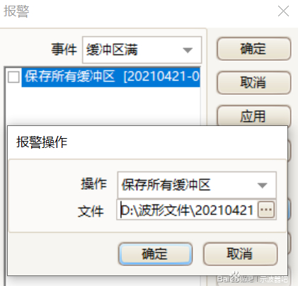接着我们要设置报警操作,一旦缓冲区满了,给软件指定一些指令动作。点击“添加”选项,可以看到各种报警操作。我们希望缓冲区满之后,软件首先要自动保存波形文件到电脑的某个文件夹下,这样才能清出缓冲继续下一次信号采集。保存完波形文件后,接着让软件重新捕获。