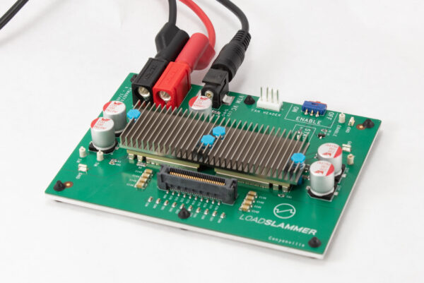 The LoadSlammerTM Canyonville board has a variety of applications allowing the user to calibrate, validate, and test devices with exceptional PDN characteristics. The board is capable of multiphase testing, large signal stability analysis, continuous (230Amps), and transient (500Amps) output with adjustable voltage and current.